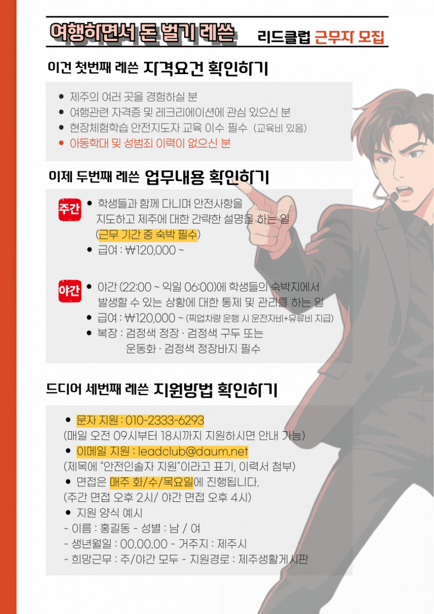 ☆제주_수학_여행_인솔자_근무자구인☆!!!& 페이지 정보 작성자 차OO만 작성일25-09-28 18:00 조회208회 연락처 010-5227-3021 급여 일당 : 130,000 관련링크 본문 주소 : 노연로 55 4층 이전글 다음글 목록