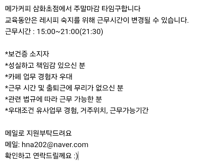 메가삼화초점주말마감모집합니다 페이지 정보 작성자 돌굴 작성일25-12-29 11:09 조회196회 연락처 010-7170-3336 급여 시급 : 10030 관련링크 본문 메가삼화초점주말마감모집합니다. 주소 : 제주시 화삼로19 삼화빌딩 1층 메가커피 삼화초점 이전글 다음글 목록
