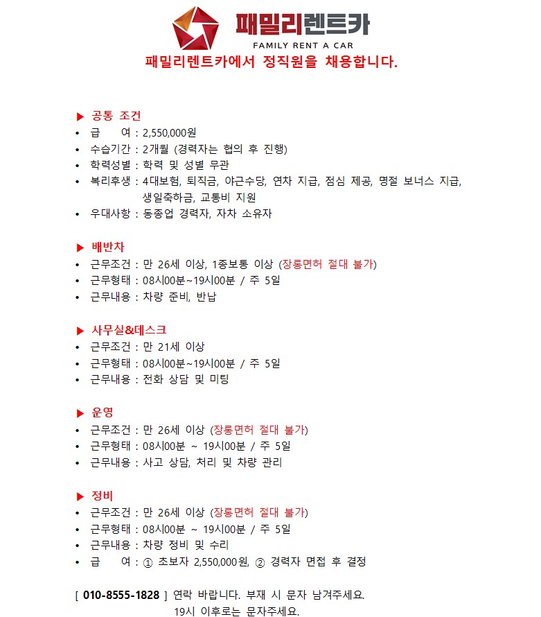 패밀리렌트카 파트별 정직원 채용 페이지 정보 작성자 패OOOO카 작성일25-06-30 10:08 조회1,121회 연락처 010-8555-1828 급여 월급 : 255만+@ 관련링크 본문 연락주세요 주소 : 제주특별자치도 제주시 제성1길 67 이전글 다음글 목록