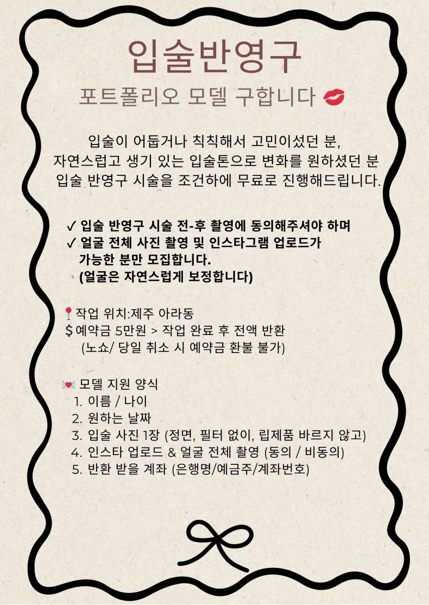 [아라동] 7월 6,7,8일 입술모델 모집❤️ 페이지 정보 작성자 겨리 작성일25-06-27 16:52 조회2,209회 연락처 010-2230-6689 급여 협의 : 0 관련링크 본문 7월 6일 1명7월 7일 1명7월 8일 1명40만원 상당의 입술 작업 조건하에 무료로 작업해드립니다.지원양식 작성하여 문자로 보내주세요.더 많은 사진은 인스타그램 @gonggan_beauty 주소 : 제주시 인다5길 11-8 이전글 다음글 목록