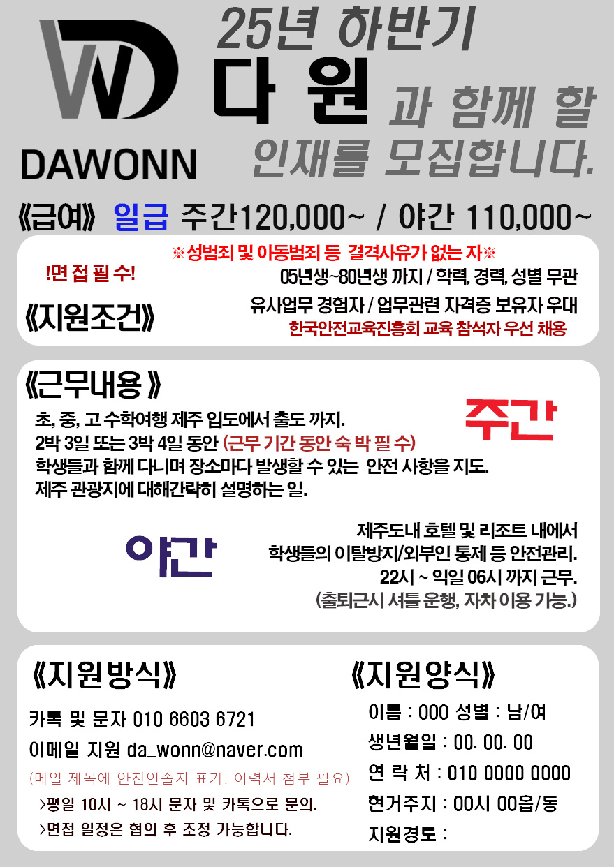 10월 단기 수학여행 주간 안전인솔자 모집 페이지 정보 작성자 dOOOOn 작성일25-09-22 09:56 조회243회 연락처 010-6603-6721 급여 일당 : 120000 관련링크 본문 . 주소 : 제주특별자치도 제주시 삼무로 15 연동태홍누리안3차아파트 204호 이전글 다음글 목록