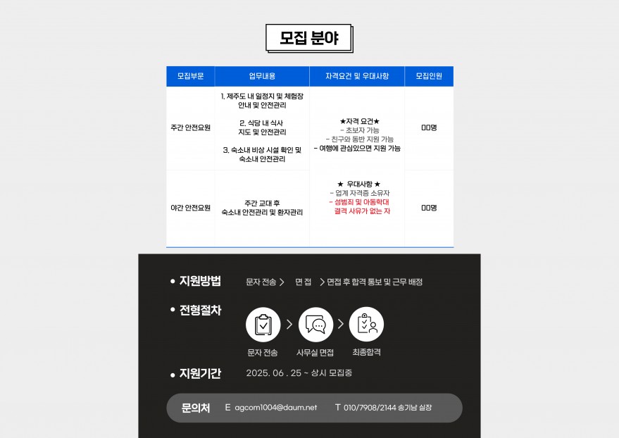 25년도 하반기 ( 9월 ~ 11월초 ) 주간 및 야간 안전요원을 모집합니다.