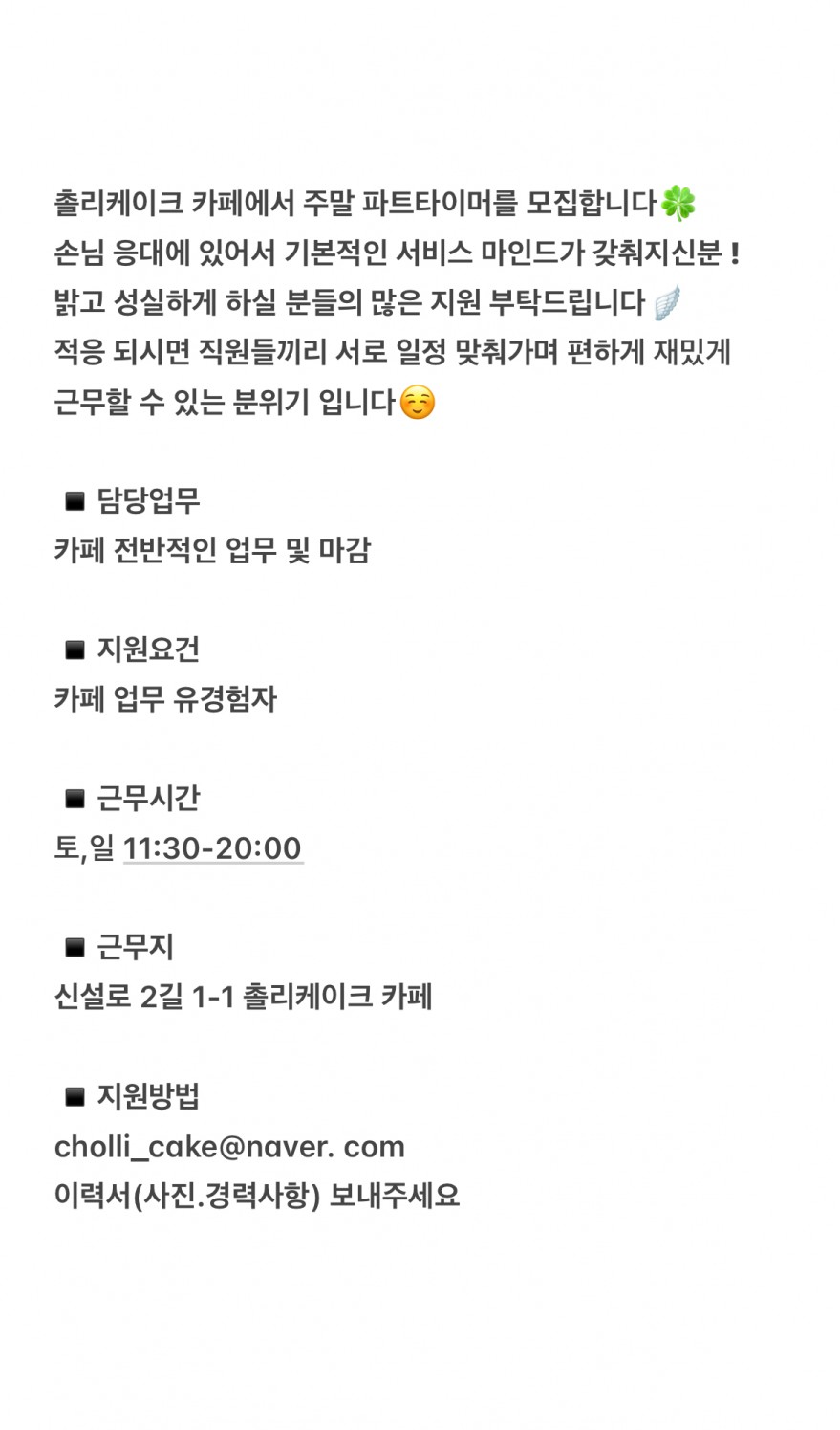 촐리케이크 주말 풀타임 파트타이머 구합니다 페이지 정보 작성자 cOOOOe 작성일25-06-10 21:49 조회3,429회 연락처 010-000-000 급여 시급 : 11,000 관련링크 본문 주소 : 신설로2길1-1 이전글 다음글 목록
