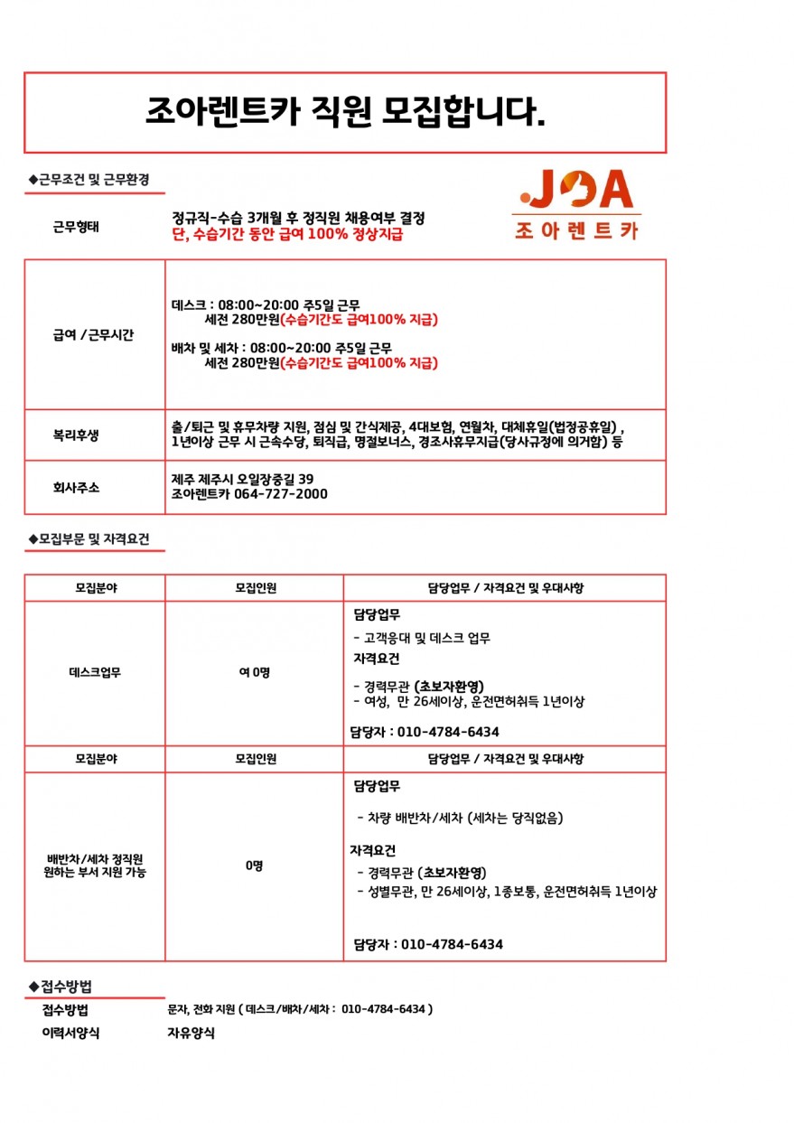 조아렌트카 데스크/배차/세차 정직원 모집합니다. 출퇴근/휴무 차량 지원 페이지 정보 작성자 jOOOOOt 작성일25-06-06 12:36 조회2,445회 연락처 010-4784-6434 급여 월급 : 280만원 관련링크 본문 주소 : 제주특별자치도 제주시 오일장중길 39 조아렌트카 이전글 다음글 목록