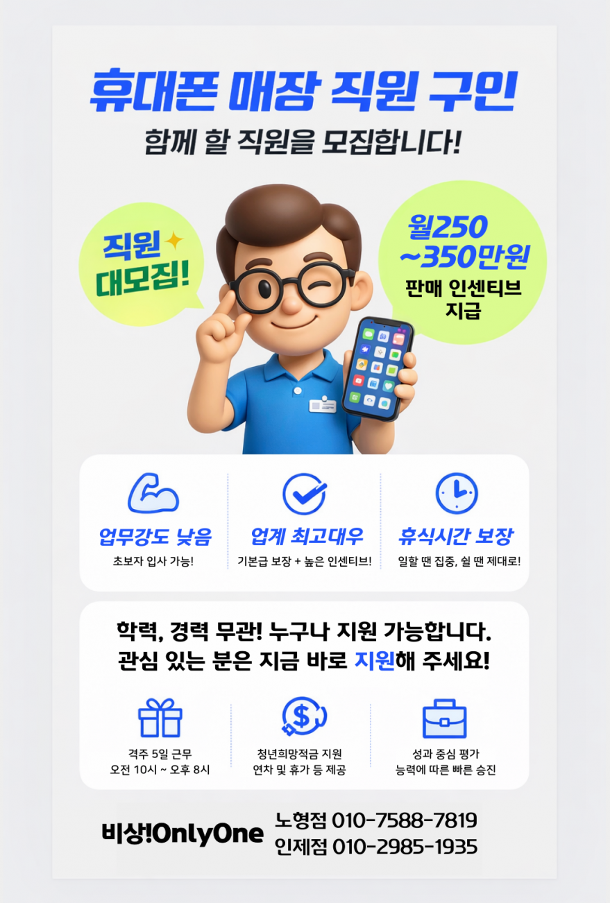 통신3사)휴대폰⭐️비상!OnlyOne⭐️남녀직원모집^^ 페이지 정보 작성자 일OO손 작성일26-01-07 16:09 조회64회 연락처 010-7588-7819 급여 월급 : 250만원 이상 관련링크 본문 - 주소 : 제주 제주시 월랑로 8길 1 이전글 다음글 목록