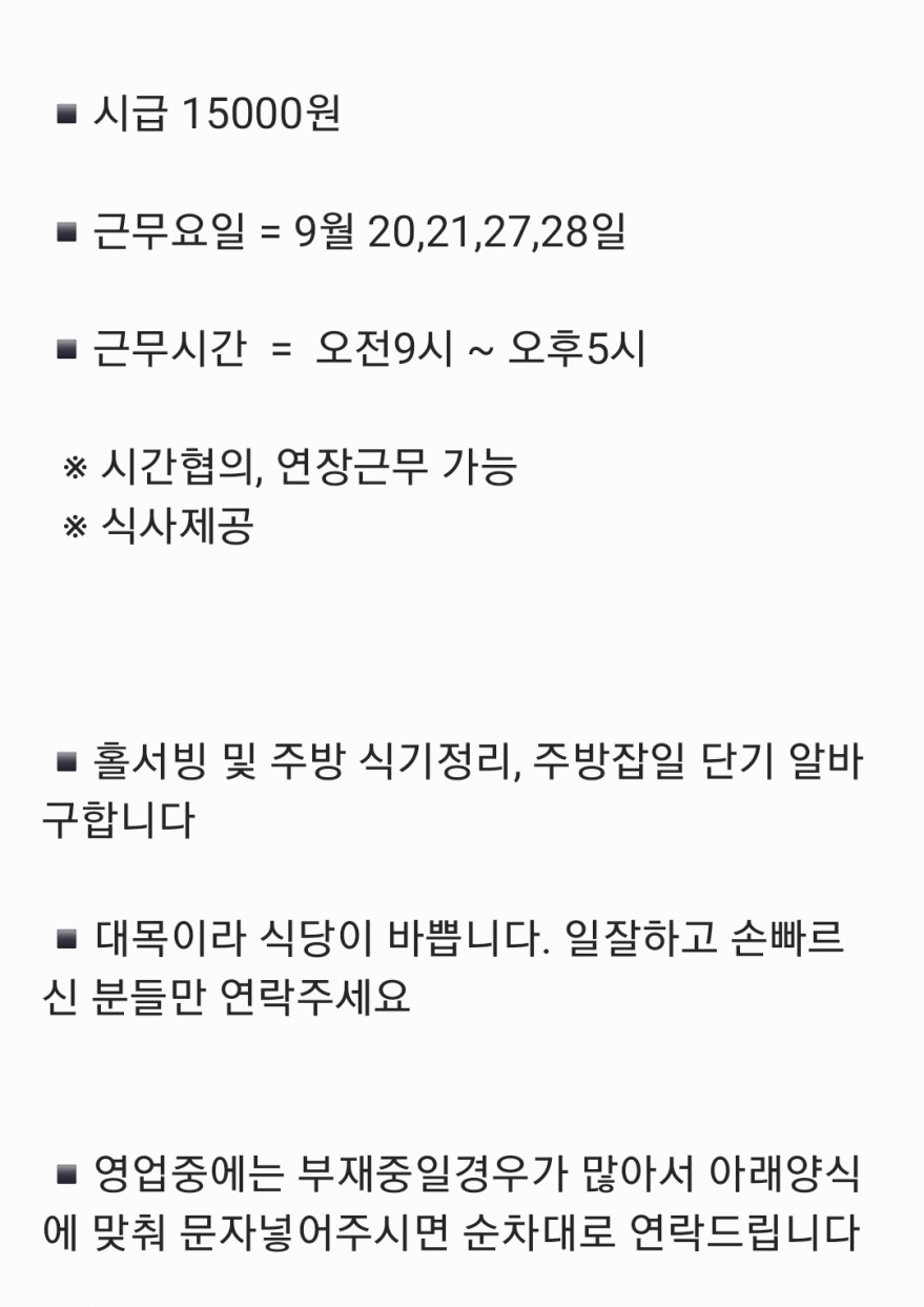 식당단기파트타임[홀서빙,주방(잡일)] 페이지 정보 작성자 pOOOOO5 작성일25-09-15 07:40 조회471회 연락처 010-4735-0155 급여 시급 : 15000만원 관련링크 본문 . 주소 : 천덕로440-1 이전글 다음글 목록