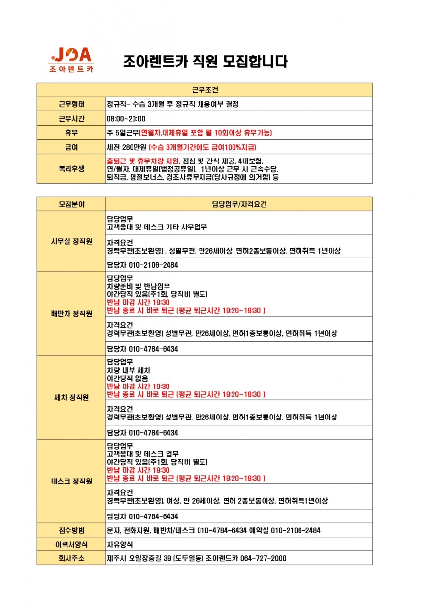 ❤️조아렌트카❤️예약실 데스크 배차 세차 ᕕ( ᐛ )ᕗ 출퇴근 휴무 차량 지원 페이지 정보 작성자 쎄OO어 작성일25-12-25 17:31 조회213회 연락처 010-4784-6434 급여 월급 : 280만원 관련링크 본문 주소 : 제주특별자치도 제주시 오일장중길 39 조아렌트카 이전글 다음글 목록