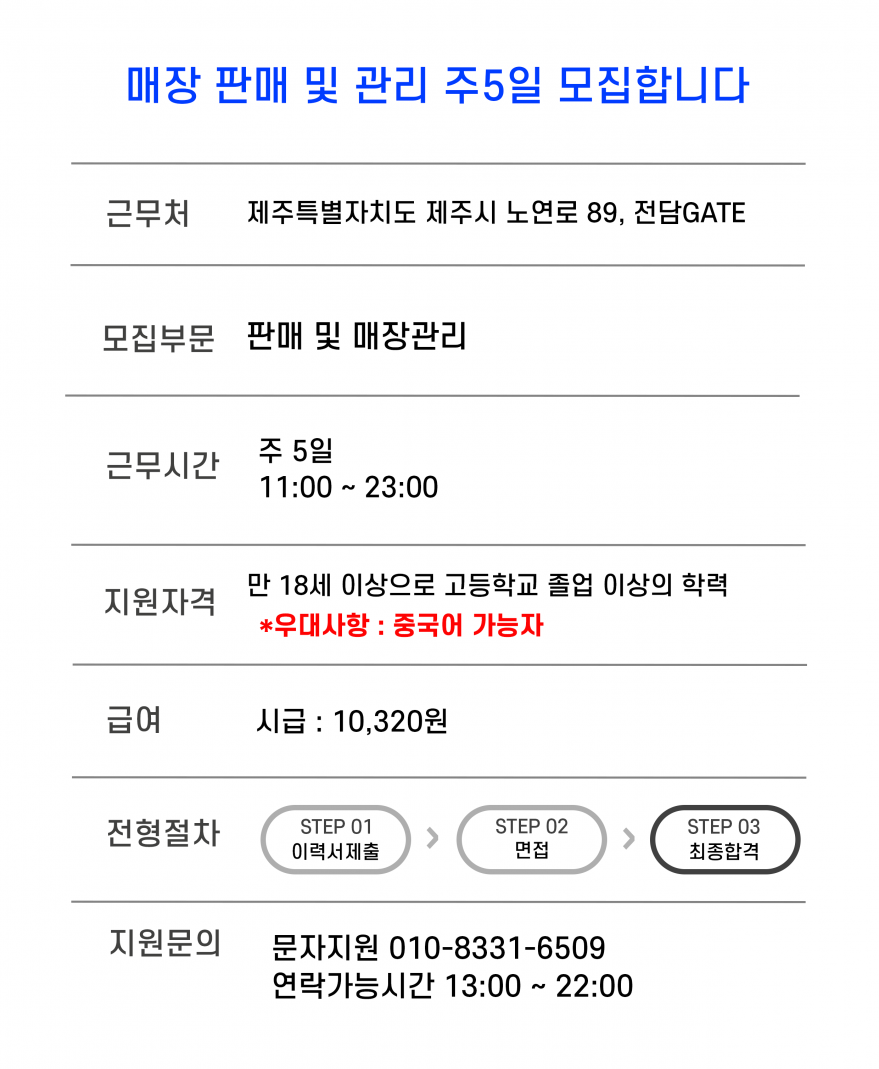 ★★★ 세상에서 제일 쉬운 판매직 직원을 모집합니다 ★★★ 페이지 정보 작성자 곽O식 작성일25-11-24 18:27 조회17회 연락처 010-8331-6509 급여 시급 : 10,320 관련링크 본문 ■ 주업무 : 고객이 물건 선택하면 결제 후 봉투에 담아드리기. 외워야 할 내용 거의 없음. ■ 근무지 : 연동 주소 : 제주특별자치도 제주시 노연로 89 1층 전담GATE 이전글 다음글 목록