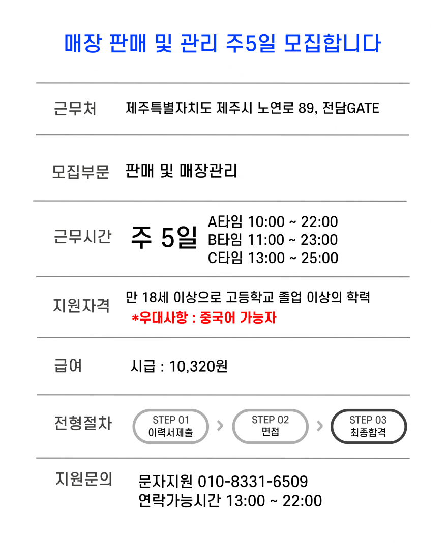 ★★★ 세상에서 제일 쉬운 판매직 직원을 모집합니다 ★★★ 페이지 정보 작성자 곽O식 작성일25-11-27 18:21 조회44회 연락처 010-8331-6509 급여 시급 : 10,320 관련링크 본문 ■ 주업무 : 고객이 물건 선택하면 결제 후 봉투에 담아드리기. 외워야 할 내용 거의 없음. ■ 근무지 : 연동 주소 : 제주특별자치도 제주시 노연로 89 1층 전담GATE 이전글 다음글 목록