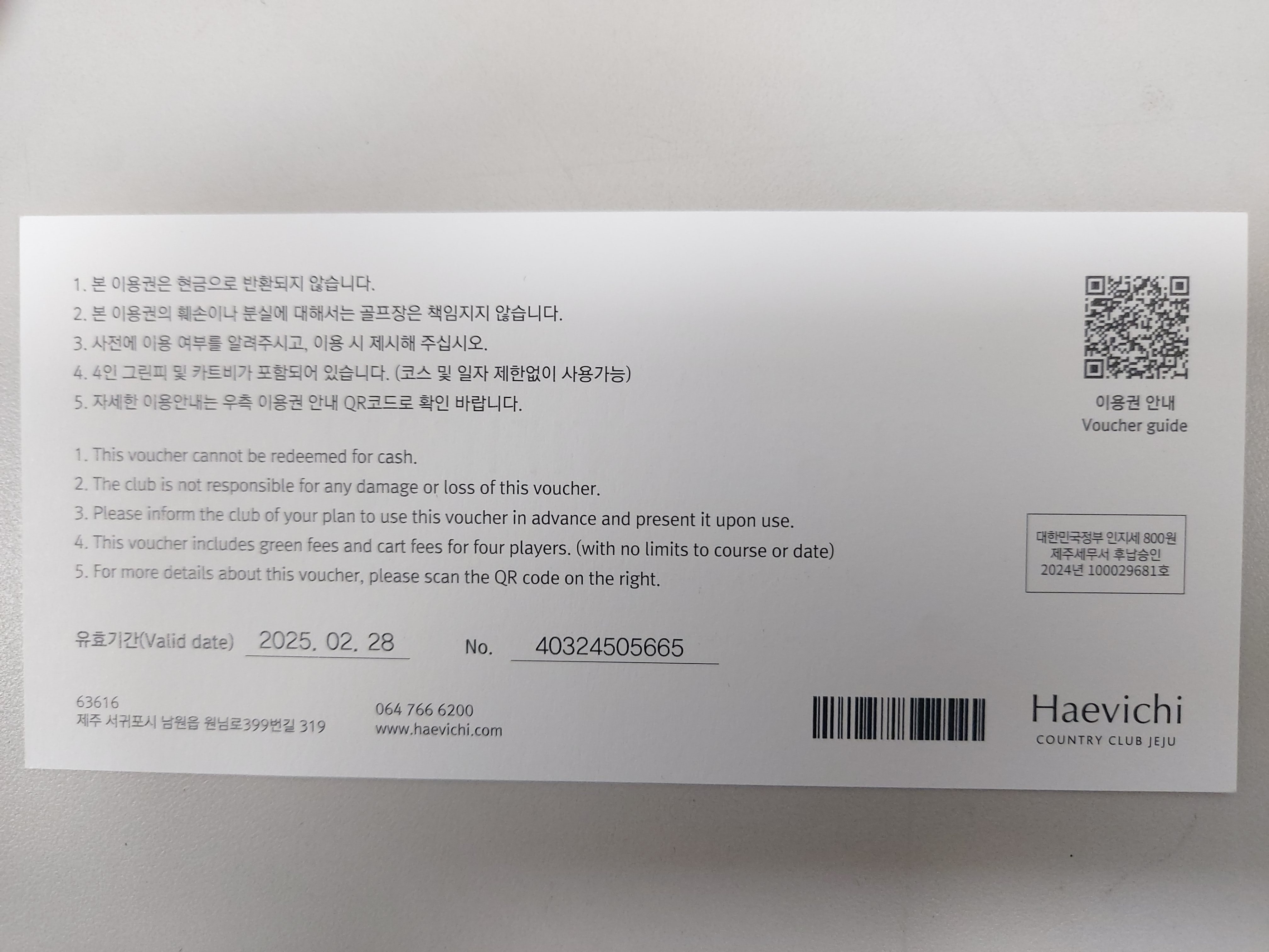 티켓 번호 (40324505665)로 해비치골프장에 확인 가능합니다.