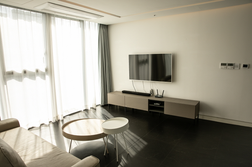 풀옵션: 특급호텔침구세트, 비데, 욕조, 다이슨 공기청정기, 다이슨 무선청소기, 퀸 침대, 아일랜드식탁, 식탁의자2EA, 붙박이장, 드럼세탁기(빌트인10KG), 벽걸이TV, 인덕션, 냉장고(엘지320L), 천장형 시스템 냉온풍기2EA, 전자레인지. 야마하 블루투스 스피커, 거실협탁, 기본식기, 와인잔, 전기포트, 헤어드라이기, 침대형 거실쇼파