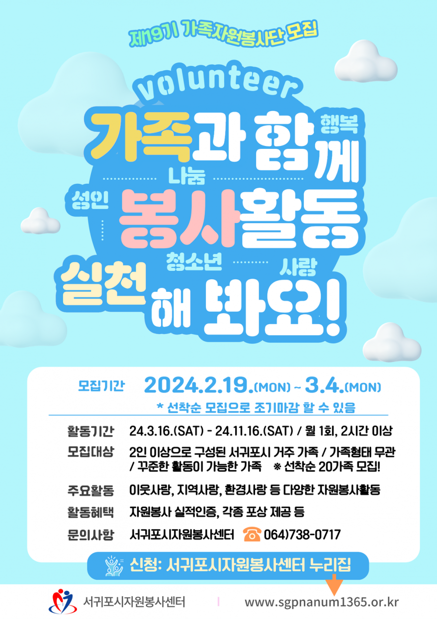 기타 | 제19기 가족자원봉사단 모집 페이지 정보 작성자 서OOOOOOOO터 작성일24-02-21 10:50 조회6,395회 연락처 010-738-0717 관련링크 본문 서귀포시자원봉사센터에서'제19기 가족자원봉사단'을 모집합니다!많은 참여 부탁드립니다! 이전글 다음글 목록