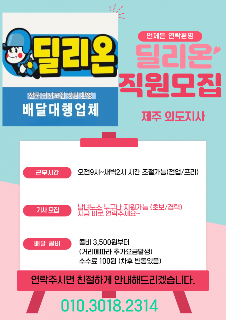 ★★★★★ 외도 딜리온 배달대행 최저 수수료 오토바이 & 자동차 기사 모집(신규) ★★★★★