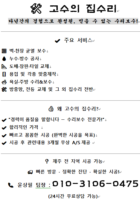 집수리/리모델링 | 제주집수리를도와드립니다. 페이지 정보 작성자 고OOOOOOOO주 작성일25-09-08 22:15 조회1,272회 연락처 010-3106-0475 관련링크 본문 안녕하세요.고수의집수리입니다. 010-3106-0475연락주시면정확한상담및현장방문을통해합리적인견적을도와드리겠습니다. 사소한문의도친절히도와드리겠습니다~ 다음글 검색 목록