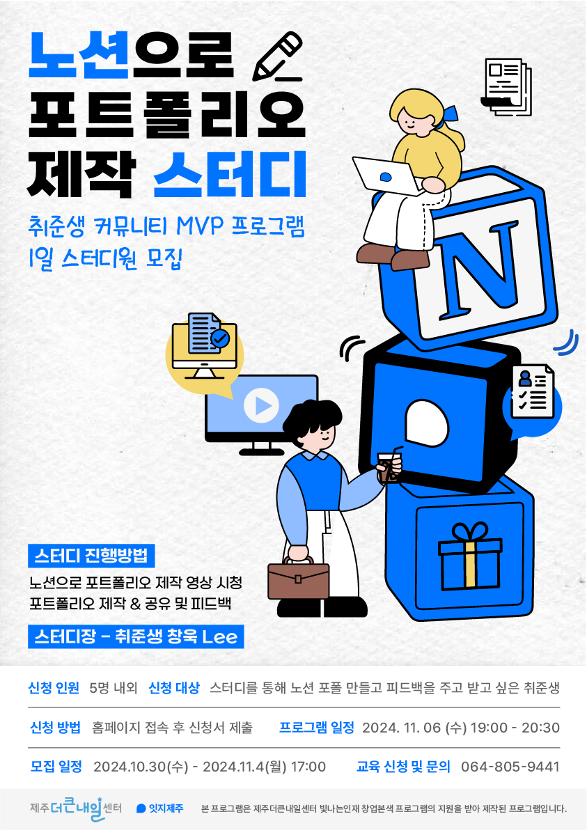 제주더큰내일센터X잇지제주 노션으로 포트폴리오 제작 스터디(~11.04) 페이지 정보 작성자 oOOe 작성일24-11-01 14:58 조회5,731회 연락처 010-6217-8599 관련링크 본문 이전글 다음글 목록