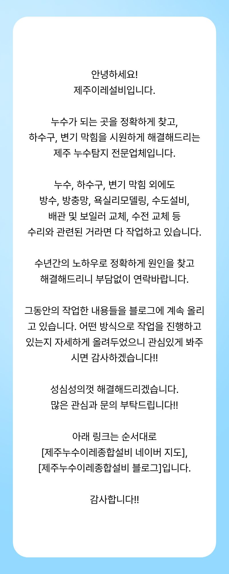 제주이레설비입니다. 페이지 정보 작성자 제OOOO비 작성일25-12-16 20:36 조회677회 연락처 010-3955-7946 관련링크 본문 안녕하세요!제주이레설비입니다. naver.me/Gn0SEyoh blog.naver.com/jeju_jireh 이전글 다음글 목록