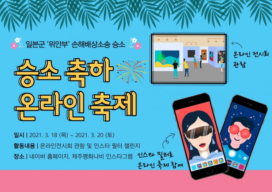 3월 18일 (목) 오늘부터 3월 20일 토요일까지 일본국 상대 손해배상청구소송 승소를 축하하는 온라인 축제를 진행합니다. 온라인 축제는 온라인 전시회와 인스타그램 필터로 구성되어 있습니다. 오늘은 전시회가 먼저 공개되고 내일은 승소 관련 영상과 승소의 내용이 담긴 인스타그램 필터가 공개됩니다!17명의 서포터즈들과 많은 내용을 재미있게 담기 위해 최선을 다해 준비했으니 3일 동안 즐겁게 봐주시고 참여도 많이 부탁드립니다. 아래 링크를 통해 들어가주세요! (영어타자로 '승소'라고 생각하시면 편합니다!)