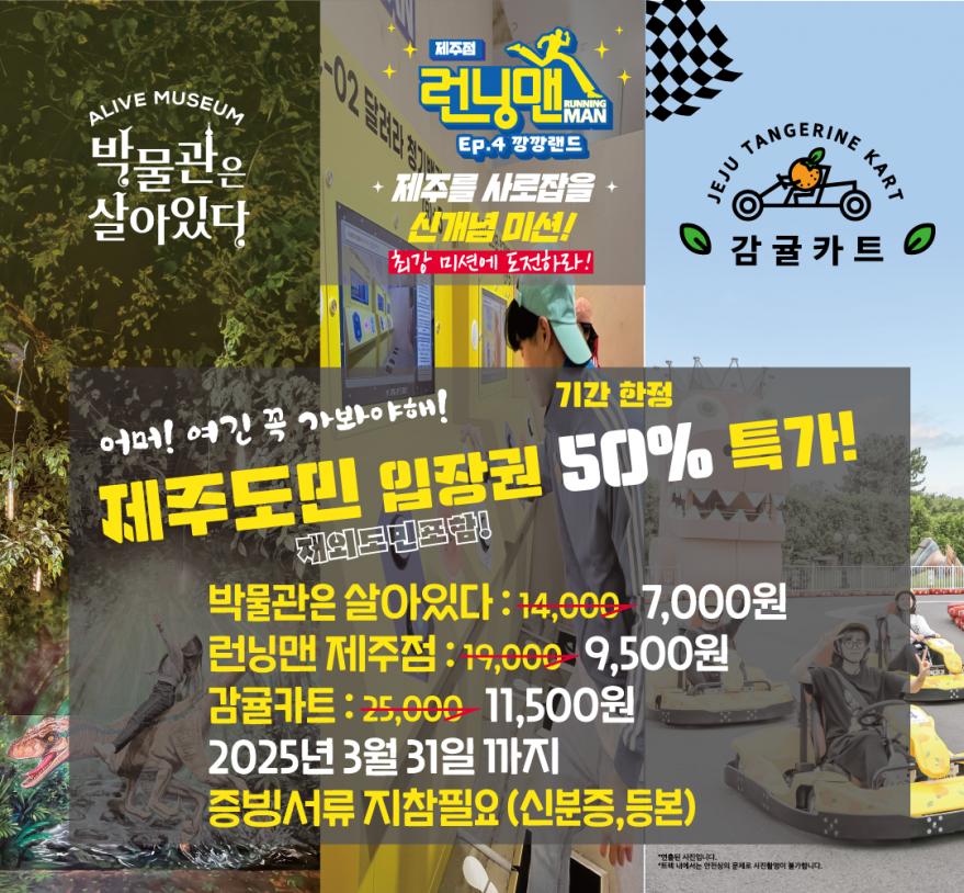 제주 중문점 박물관,감귤카트,런닝맨 체험관 도민할인 이벤트 페이지 정보 작성자 런O맨 작성일25-02-11 16:31 조회4,688회 연락처 010-1234-5678 관련링크 본문 제주도민 기간 한정 50% 특가 이전글 다음글 목록