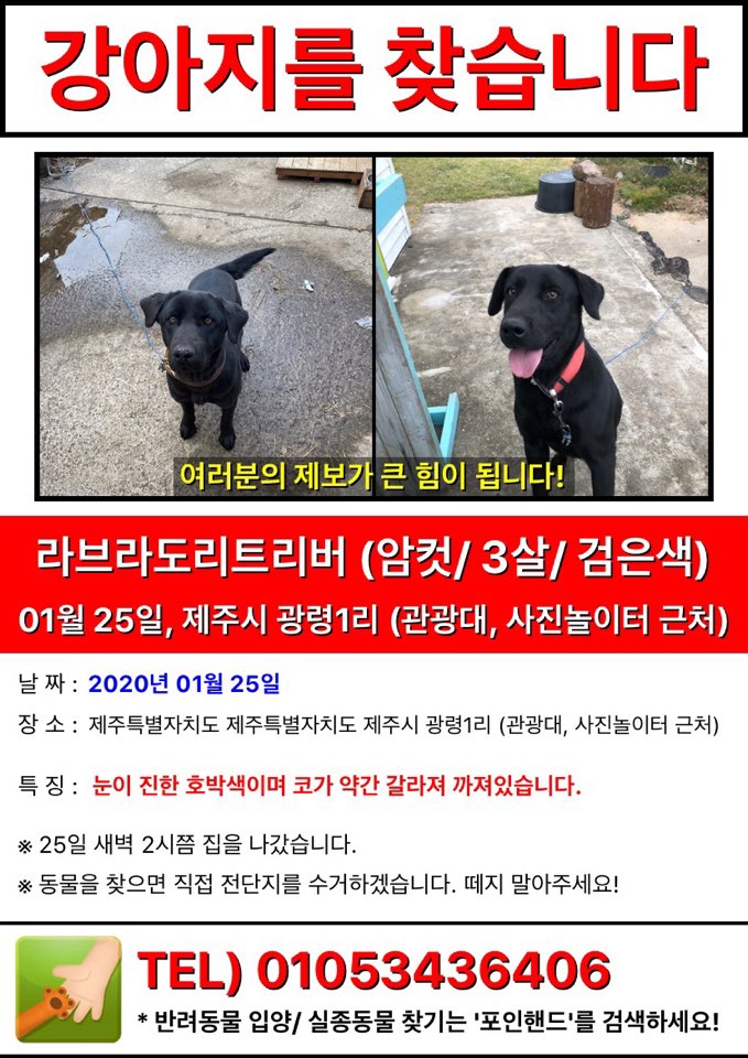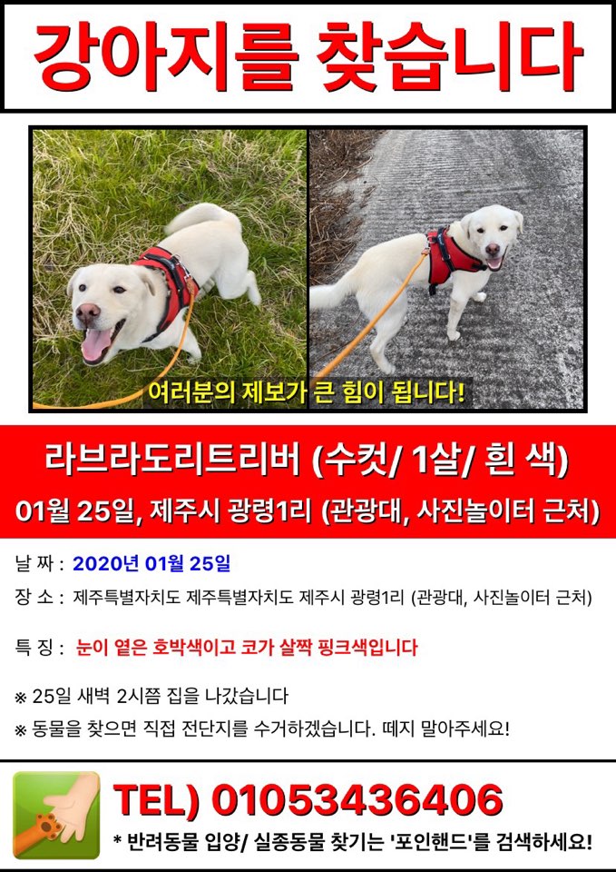 애월 강아지 찾아요.. 페이지 정보 작성자 서OOO7 작성일20-01-26 15:00 조회7,799회 연락처 010-5343-6406 관련링크 본문 강아지 목격하신 분 꼭 연락 부탁드립니다 ㅠ 25일 새벽 2시에 둘 다 집을 나갔습니다. 주변 장소는 제주시 관광대, 사진놀이터 근처입니다정말 소중한 아기들이라 애타게 찾고 있습니다.. 목격하신 분은 꼭 전단지 속 번호로 연락 한 번만 부탁드리겠습니다... 이전글 다음글 목록