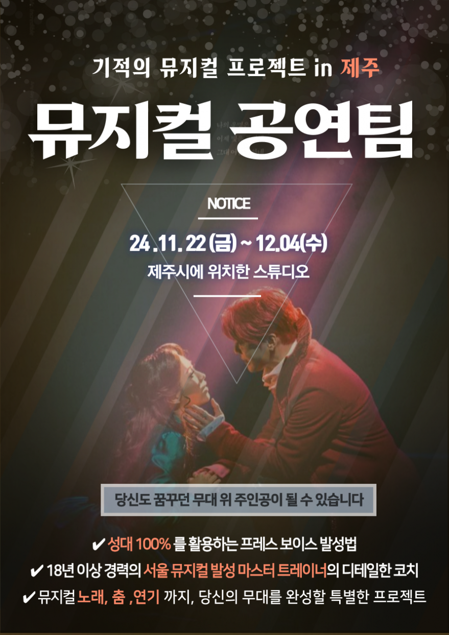 [제주] 제주에서 진행되는 특별한 뮤지컬 공연팀 프로젝트 페이지 정보 작성자 sOOOOOOO6 작성일24-11-23 02:15 조회6,153회 연락처 010-8248-7626 관련링크 본문 이전글 다음글 목록