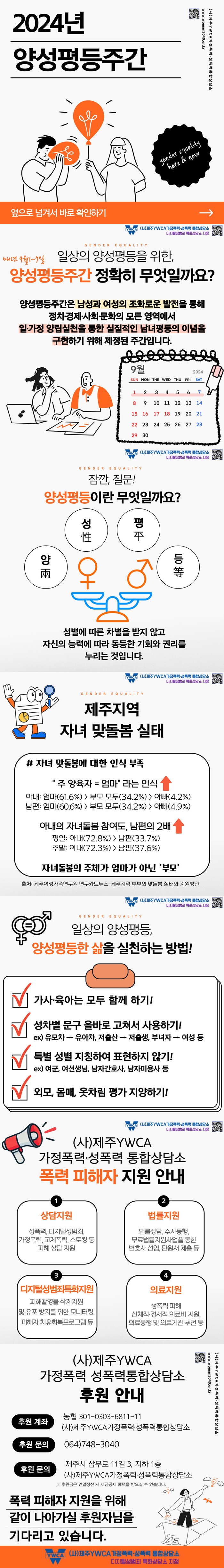 (사)제주YWCA가정폭력·성폭력통합상담소에서는 양성평등의 중요성을 알리고 평등 문화를 확산하기 위해 온·오프라인 캠페인을 진행하고있습니다.