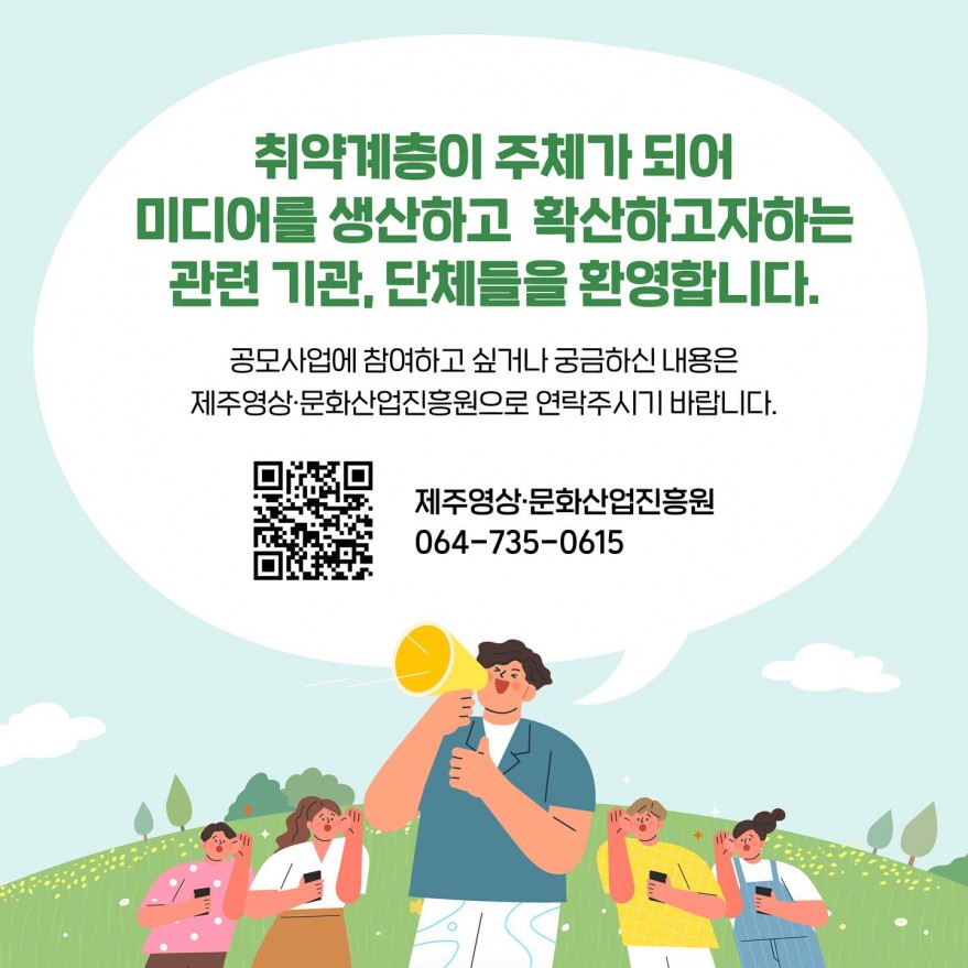 - 지원대상 : 사회적 가치 실현을 위해 제주를 기반으로 취약계층이 주체가 되어 미디어를 생산하고 확산하고자 하는 기관 및 단체
