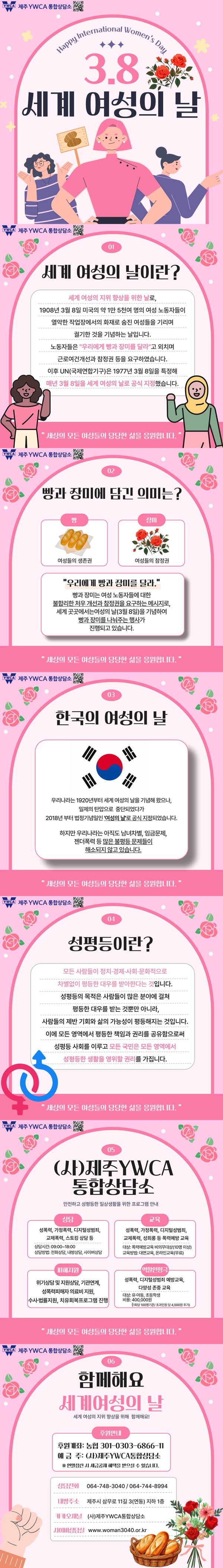 3.8 세계 여성의 날을 아시나요? 페이지 정보 작성자 제OOOOOOOOO소 작성일24-03-05 14:45 조회5,241회 연락처 010-2389-7654 관련링크 본문 3.8 세계 여성의 날을 아시나요? 우리 함께 세계 여성의 날을 알아보고 세계 여성들의 지위 향상을 위해 함께 해요! 이전글 다음글 목록