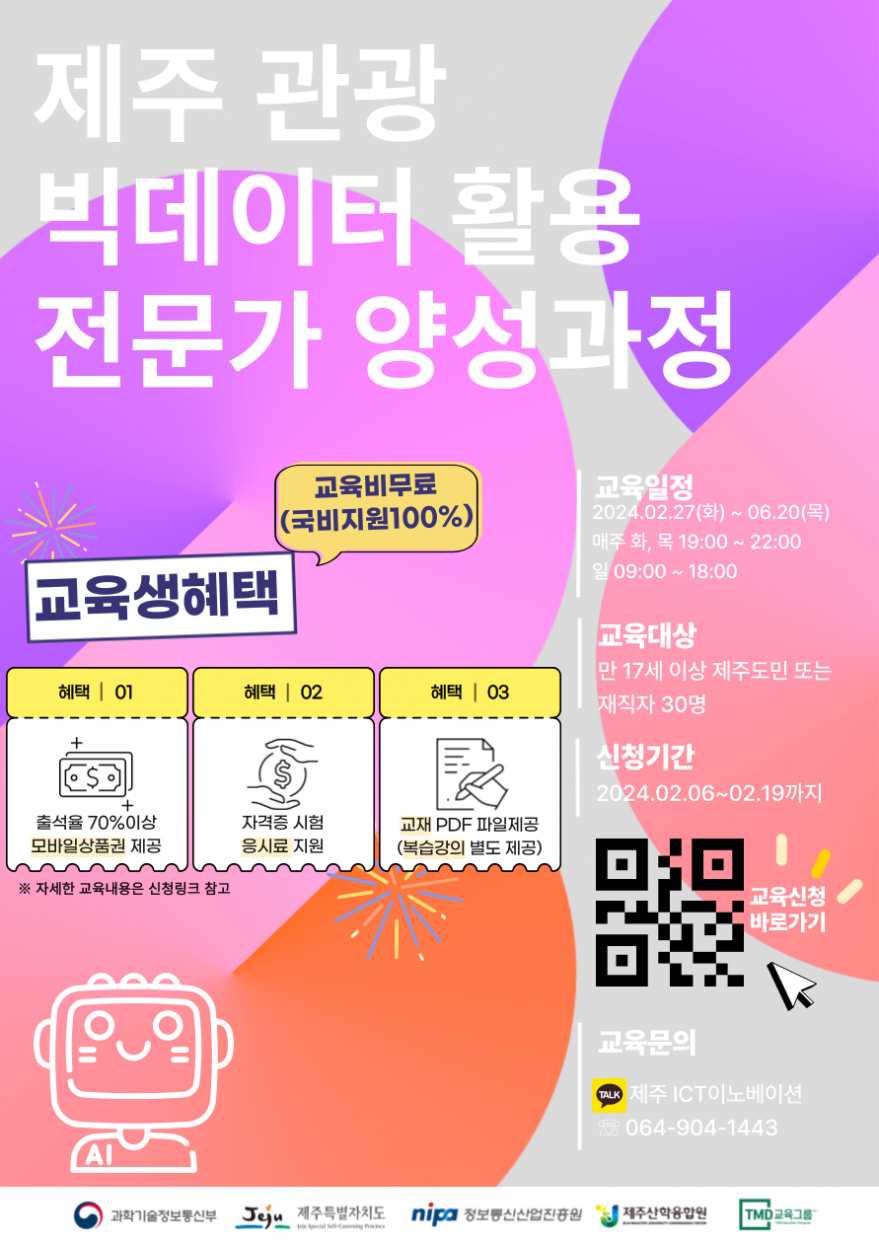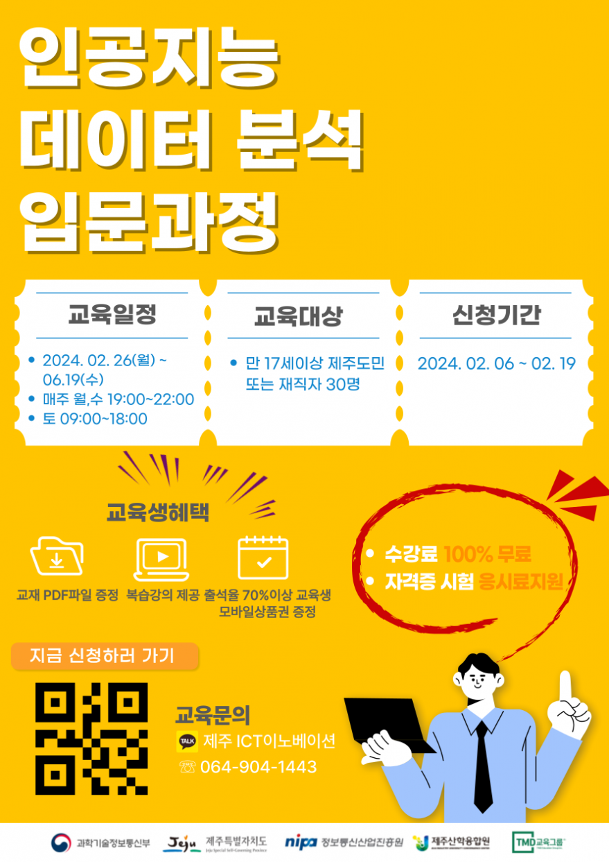 [무료교육] 인공지능, 데이터 분야 교육생 모집 페이지 정보 작성자 제OOOOOOOO국 작성일24-02-07 16:28 조회4,639회 연락처 010-5509-1301 관련링크 본문 2024 제주 ICT이노베이션 운영사무국입니다.인공지능과 데이터 시대를 주도해, 각 분야의 전문가로 성장할 절호의 기회!지금 바로 교육 신청하세요!상세 내용은 포스터 참고 바랍니다. 이전글 다음글 목록