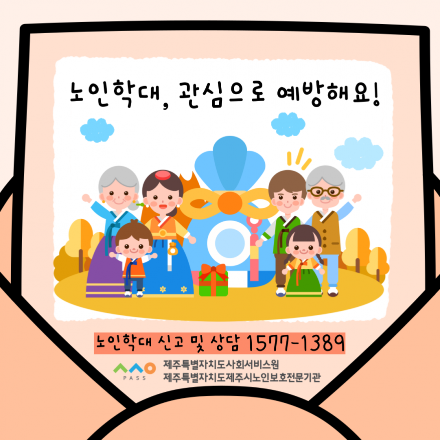[제주특별자치도제주시노인보호전문기관] 2월 노인학대 예방 포스터 페이지 정보 작성자 제OOOOOOOOO관 작성일24-02-01 13:49 조회4,564회 연락처 010-4690-1389 관련링크 본문 안녕하세요! 제주시노인보호전문기관입니다.2월도 노인학대예방을 위해 많은 관심 부탁드립니다!다가오는 설에도 새해 복 많이 받으세요^.^ 이전글 다음글 목록