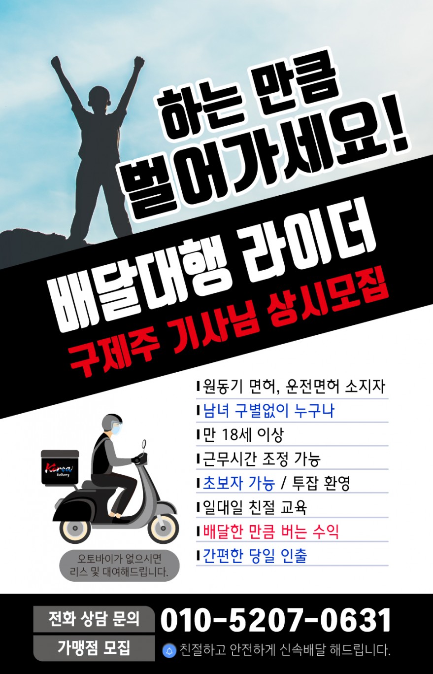 [구제주] 배달/라이더/기사님/모집[남녀구분없이] 페이지 정보 작성자 코OOOOO리 작성일24-01-25 03:45 조회4,903회 연락처 010-5207-0631 관련링크 본문 [구제주] 에서 함께 배달일 할 기사님 모집합니다.성별 상관없이 초보자도 가능하니 편하게 연락하고상담 받아 보세요 이전글 다음글 목록