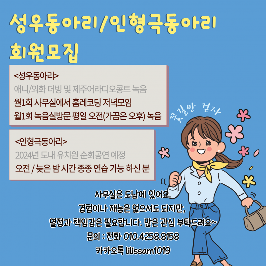 성우동아리/인형극동아리 활동회원 모집합니다. 페이지 정보 작성자 소OO구 작성일24-01-12 22:27 조회4,991회 연락처 010-4258-8158 관련링크 본문 안녕하세요 재잘재잘소리친구협동조합에서 운영하는 동아리에요. 경험이 없으셔도 상관 없으세요. 인형극 공연의 경우 소소하지만 공연비는 있습니다. 가입비 5만원 6개월마다 회비 7만원입니다. 많은 관심 부탁드려요 카톡으로 연락주시면 응답이 빨라요^^ 이전글 다음글 목록