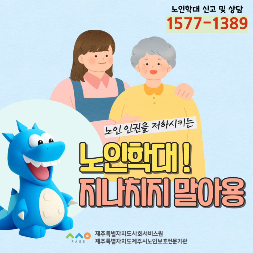 [제주특별자치도제주시노인보호전문기관] 1월 노인학대 예방 포스터 페이지 정보 작성자 제OOOOOOOOO관 작성일24-01-05 16:27 조회5,088회 연락처 010-4690-1389 관련링크 본문 안녕하십니까!제주특별자치도 노인보호전문기관이 '제주특별자치도제주시노인보호전문기관'으로 명칭 변경되었습니다.바뀐 기관명도 꼭 기억해주시고 앞으로도 많은 관심 부탁드립니다!갑진년, 새해 복 많이 받으세요:)노인학대 신고 및 상담 1577-1389 이전글 다음글 목록
