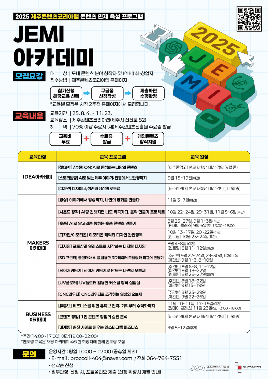 ▸ 참여혜택: 교육생 수강료 전액 무료, 제주콘텐츠코리아랩 수료증 발급 (70% 이상 출석 시)