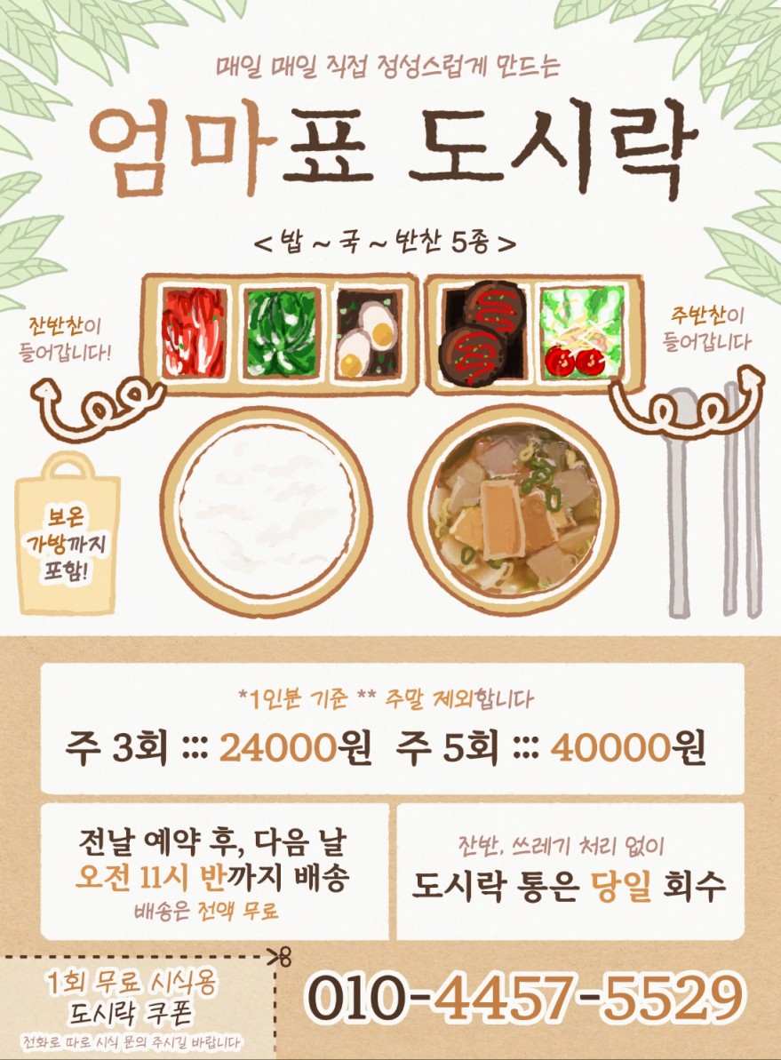 - 미리 전화로 예약 주시면 당일 날 오전 11시 반 정도에 배달해드립니다. (당일 예약 불가능 / 공휴일 포함)