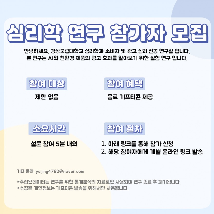 안녕하세요. 경상국립대 심리학과 소비자 및 광고 심리 전공 연구실입니다.