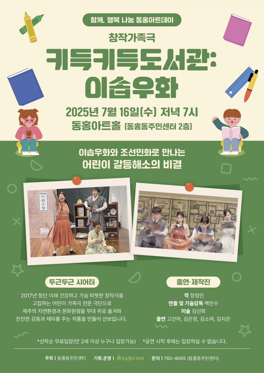 7월 동홍아트데이 무료 공연 안내 가족창작극 《키득키득도서관》