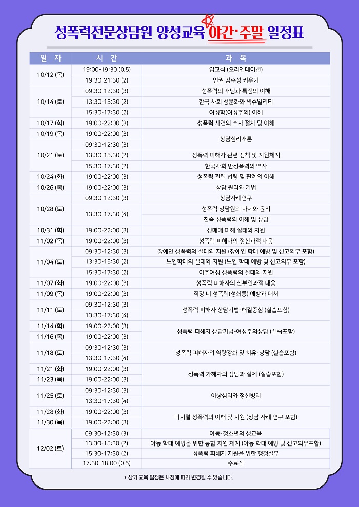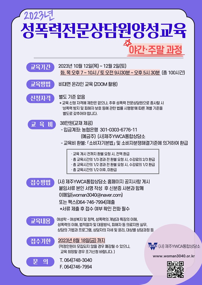 성폭력전문상담원 양성교육 야간·주말과정 교육생 모집 페이지 정보 작성자 제OOOOOOOOO소 작성일23-06-26 11:52 조회4,508회 연락처 010-2389-7654 관련링크 본문 2023년 성폭력전문상담원 양성교육 야간·주말과정 (사)제주YWCA통합상담소에서는 성폭력 피해자 상담 지원을 위한 성폭력전문상담원 양성교육을 실시합니다. 제주YWCA통합상담소 공지사항의 붙임 내용 참고하시어 많은 신청 바랍니다. 이전글 다음글 목록