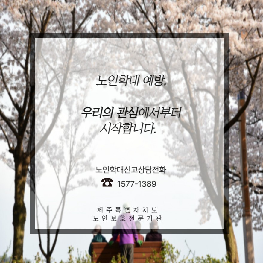 [제주특별자치도노인보호전문기관]노인학대 예방, 우리의 관심에서부터 시작합니다. 페이지 정보 작성자 제OO보 작성일23-05-30 10:12 조회4,634회 연락처 010-0000-0000 관련링크 본문 노인학대 예방, 우리의 관심에서부터 시작합니다. 이전글 다음글 목록