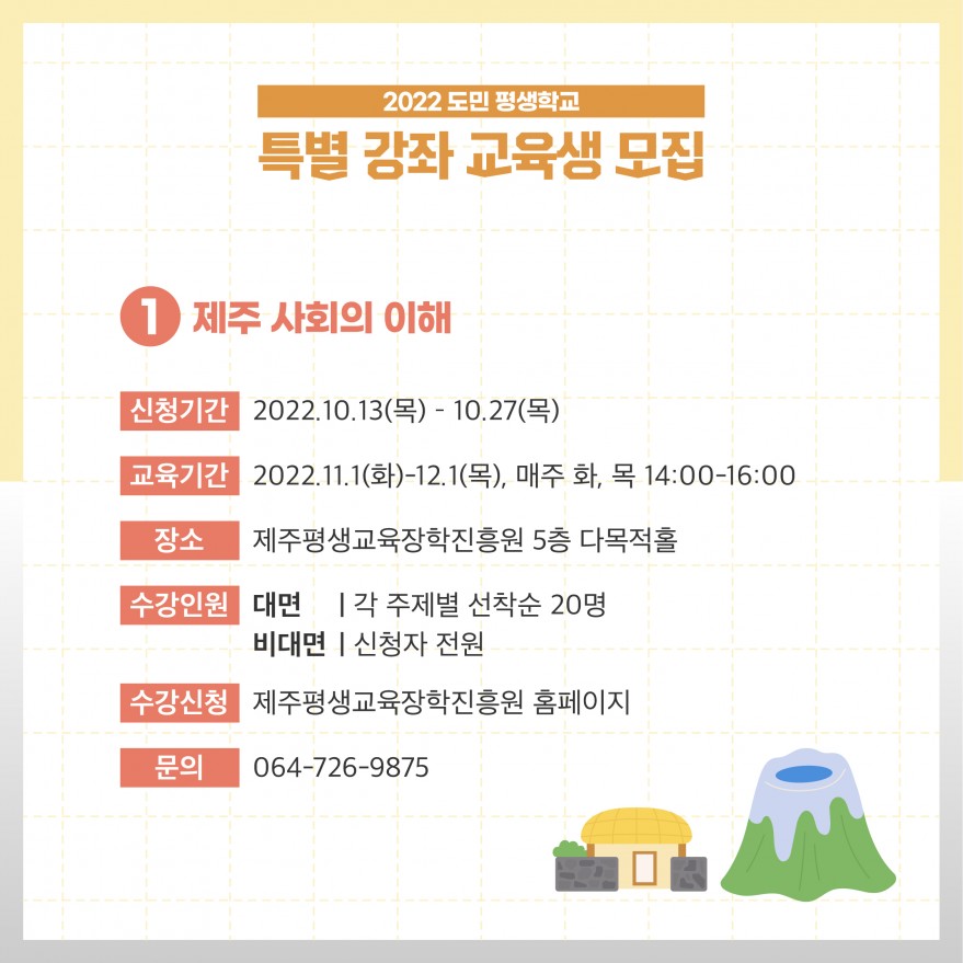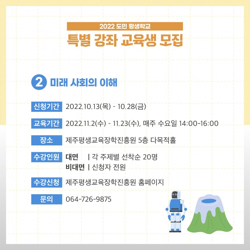 2022도민 평생학교에서 ‘제주 사회의 이해’와 ‘미래 사회의 이해’두 가지 주제의 특별강좌를 수강할 교육생을 모집합니다!
