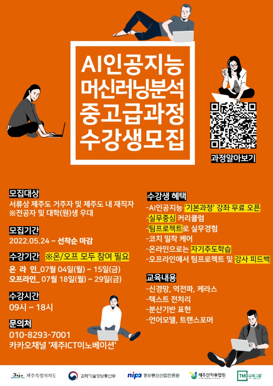 누구나 ‘AI인공지능 머신러닝 분석과정’을 통해 인공지능 관련 개발자로 성장하고 구직 또는 창업을 준비할 수 있는 프로그램입니다.하단링크 통해 자세한 내용 확인하시어 많은 신청 부탁드립니다.