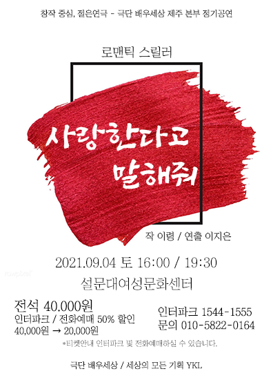 연극보러 오세용 페이지 정보 작성자 연지 작성일21-08-12 17:36 조회7,602회 연락처 010-5822-0164 관련링크 본문 2021.09.04에 성문대여성문화센터에서 ‘연극 - 사랑한다고 말해줘’를 공연합니다! 코로나 때문에 집에만 있기 심심하시죠?? 그래서 준비했습니다! 로맨스 스릴러 연극! 4시 7:30 두 타임 공연합니다!! *본 공연은 사회적 거리두기를 실시하며, 방역수칙을 준수하여 진행합니다. 이전글 다음글 목록